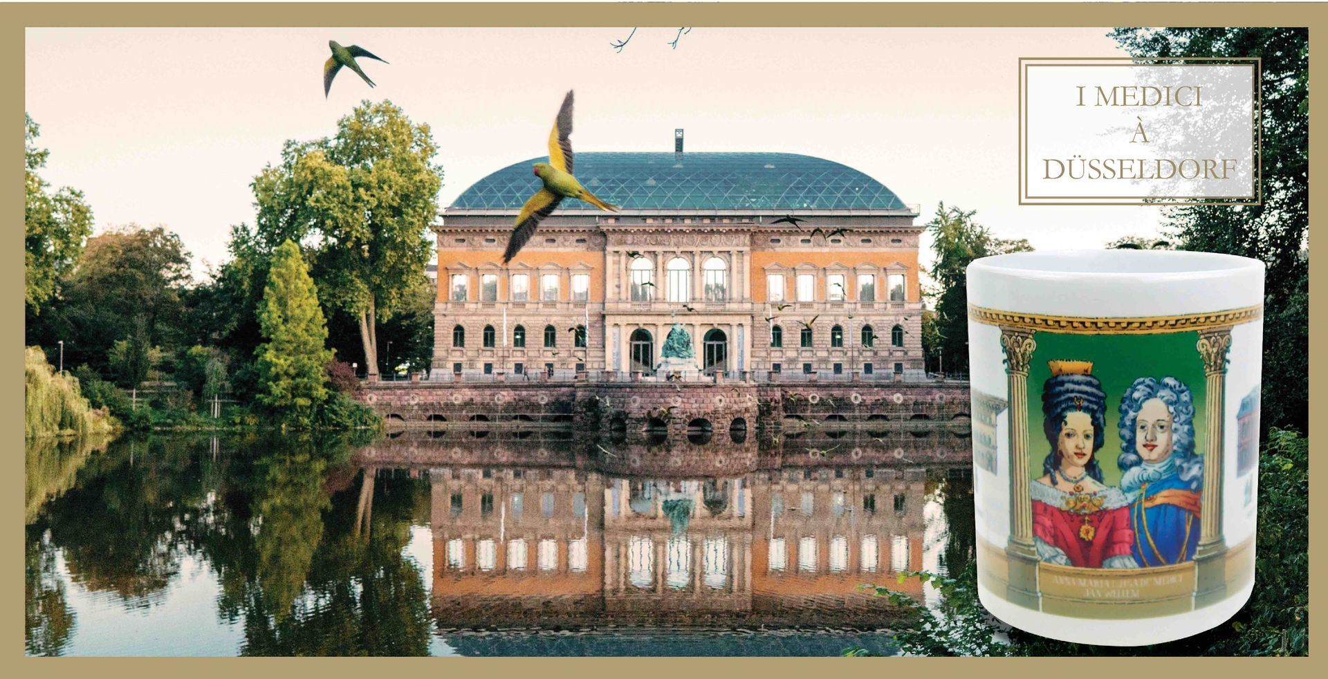 Sie war eine der berühmtesten Florentinerinnen, die jemals in Düsseldorf lebte. Anna Maria Luisa De' Medici heiratete Johann Wilhelm II., Kurfürst von der Pfalz, Herzog von Jülich-Berg, Pfalzgraf zu Neuburg - in Düsseldorf liebevoll "Jan Wellem" genannt und brachte Kunst, Kultur und Schönheit in die Stadt. Das Dekor zeigt das Schloss Jägerhof, früher auch Vénerie genannt, und den Palazzo Medici Riccardi in Florenz.