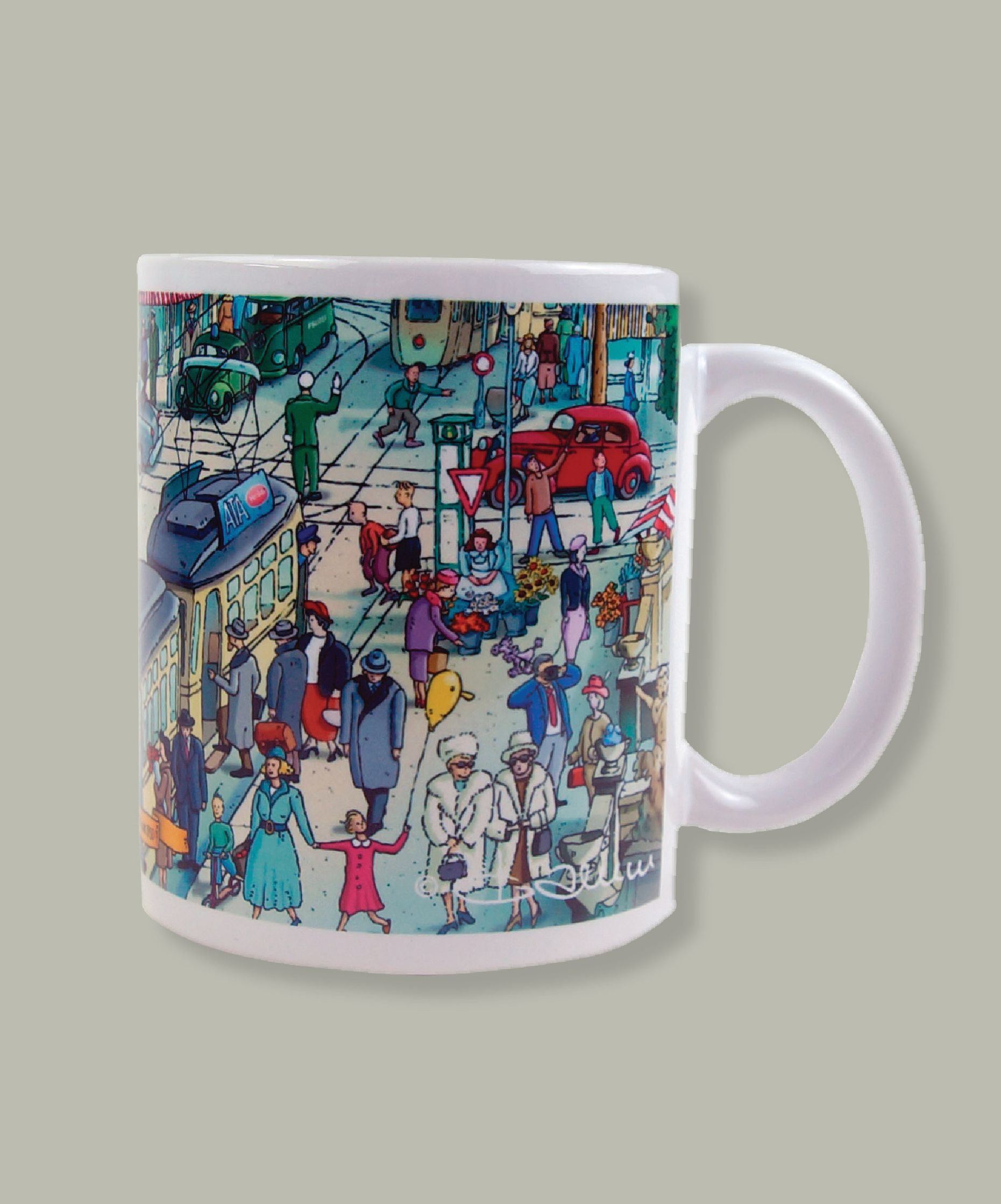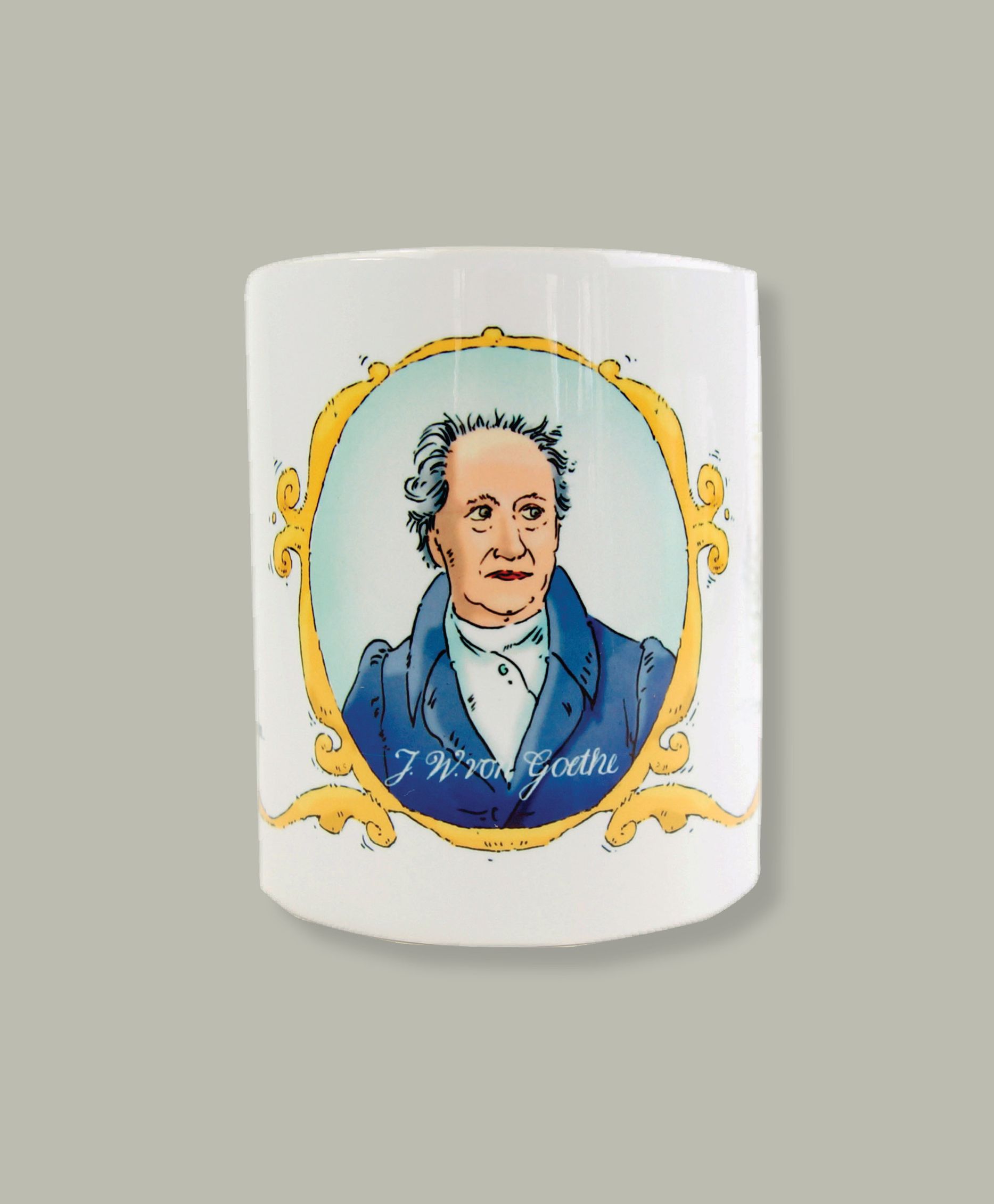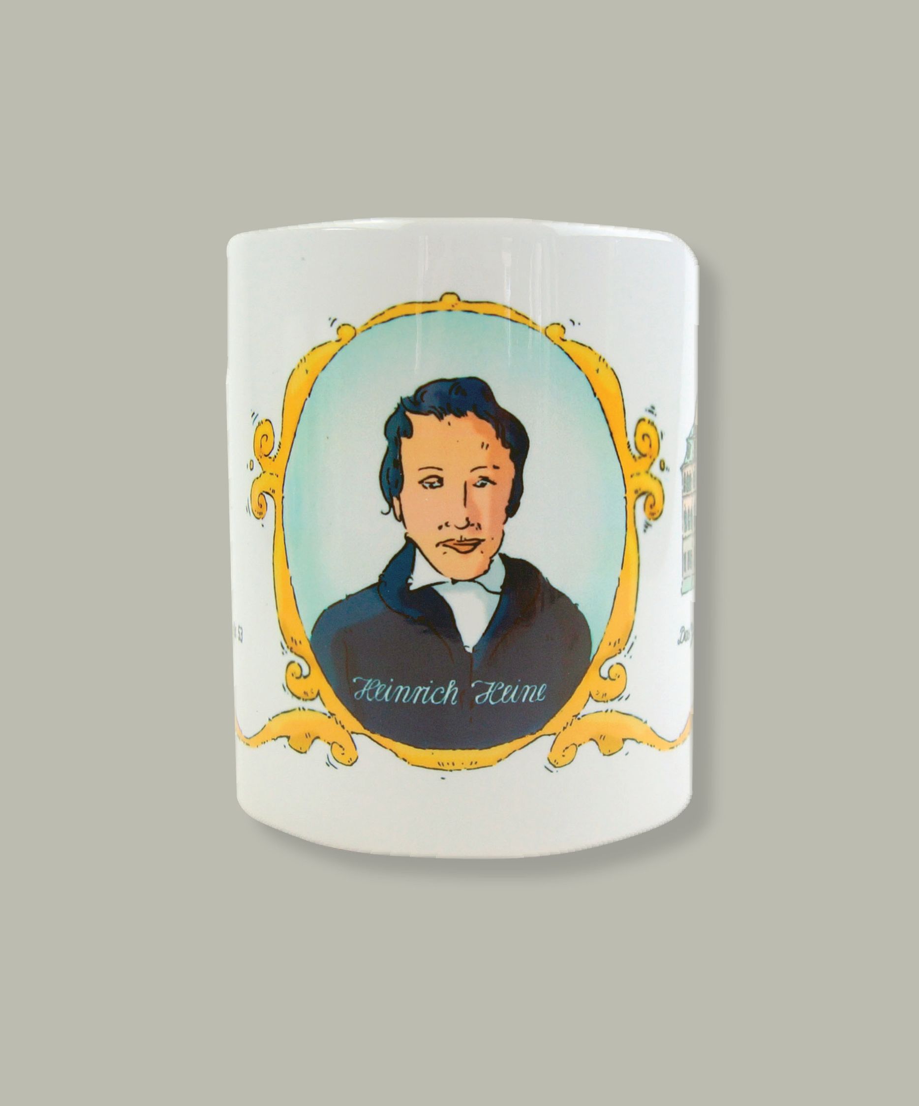 Thomas Manns Beziehungen zu der Stadt am Rhein waren sehr vielfältig. Er residierte residierte oft im Parkhotel, dem heutigen Steigenberger am Hofgarten. Auch fanden oft Lesungen statt. Der Henkelbecher zeigt Thomas Mann im Profil und wie er aus dem Felix Krull in der Schrobsdorff'schen Buchhandlung liest. Handgeschrieben vom Künstler.